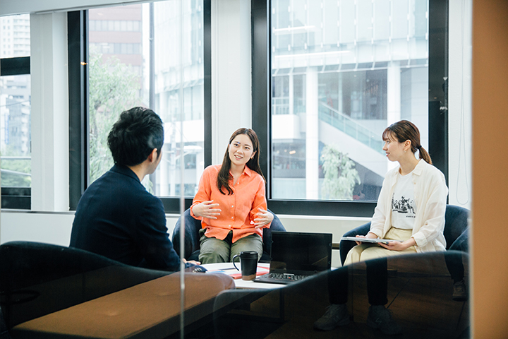 業務の打ち合わせ風景です。入社時期やポジションに関係なく、フラットに発言できる環境です。