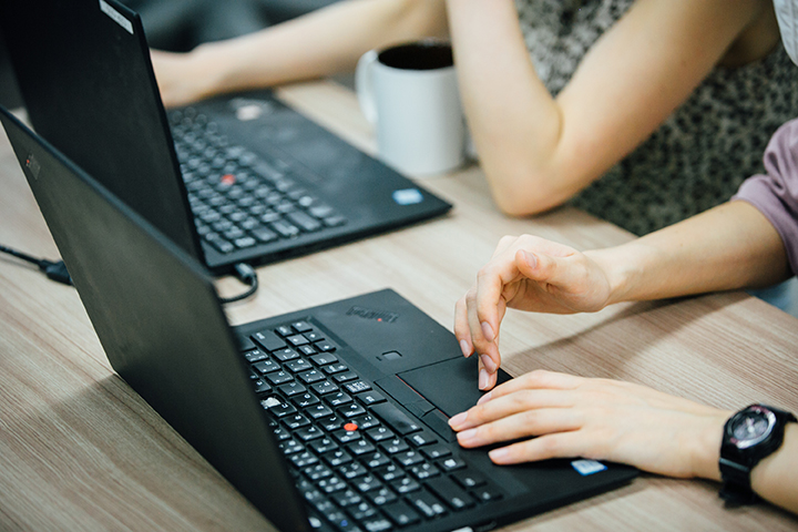 先輩社員とのオンボーディング風景です。入社後は会社や配属チームに早くなじめるよう、先輩社員がしっかりサポートします。