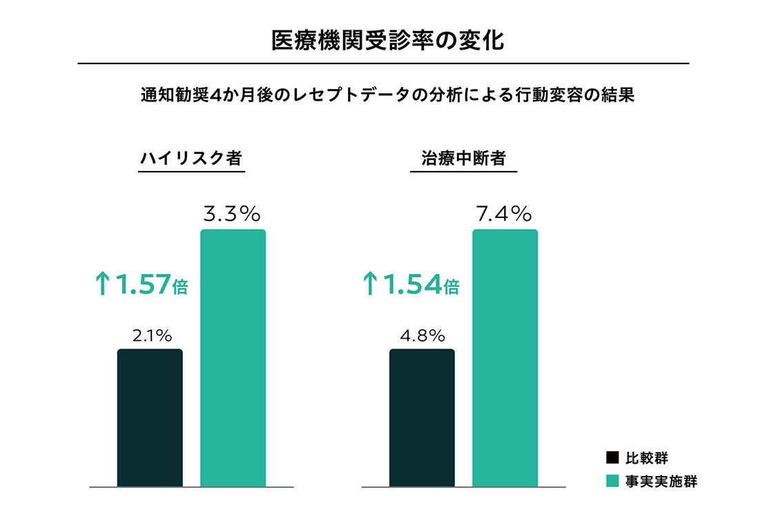 ターゲットを明確にした自治体からの啓発は、送付した通知を「自分事」として受け取りやすくするのに効果を発揮します。滋賀県長浜市との事業では、疾患の啓発通知送付後に行った対象者へのアンケート調査において、全体の約74%が「受け取った」と回答しました。また、回答者の約56%が医療機関の受診状況について「受診した」または「これから受診するつもり」と回答し、対象者の意識変容に対する一定の成果を得ることができました。さらに、比較群(前年同時期の同条件対象者)に比べ、ハイリスク者や治療中断者の医療機関受診率がそれぞれ約1.5倍に増加するなど、実際の行動変容にもつながっていることを確認しています。