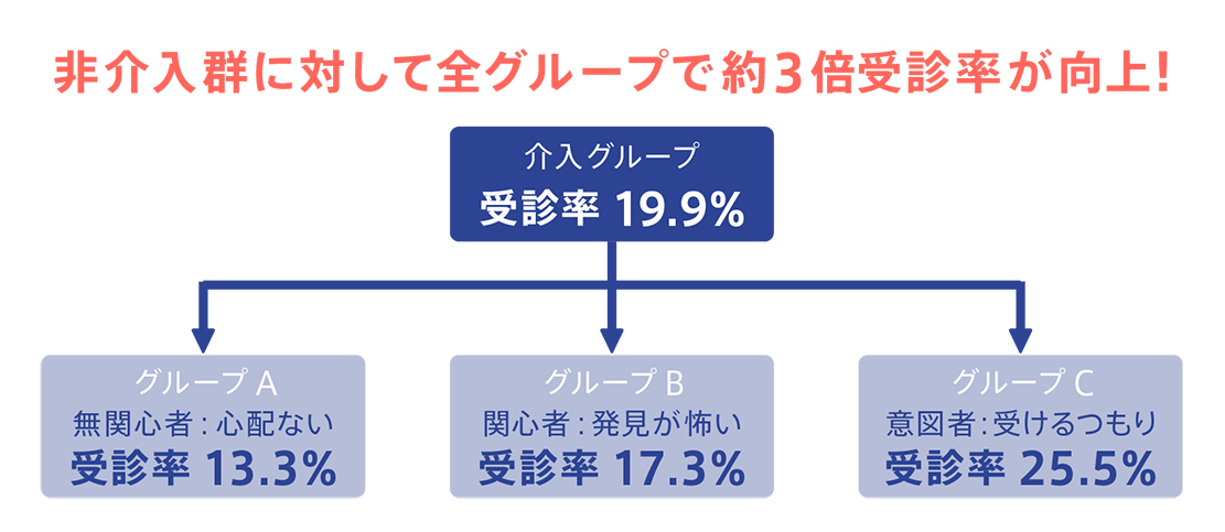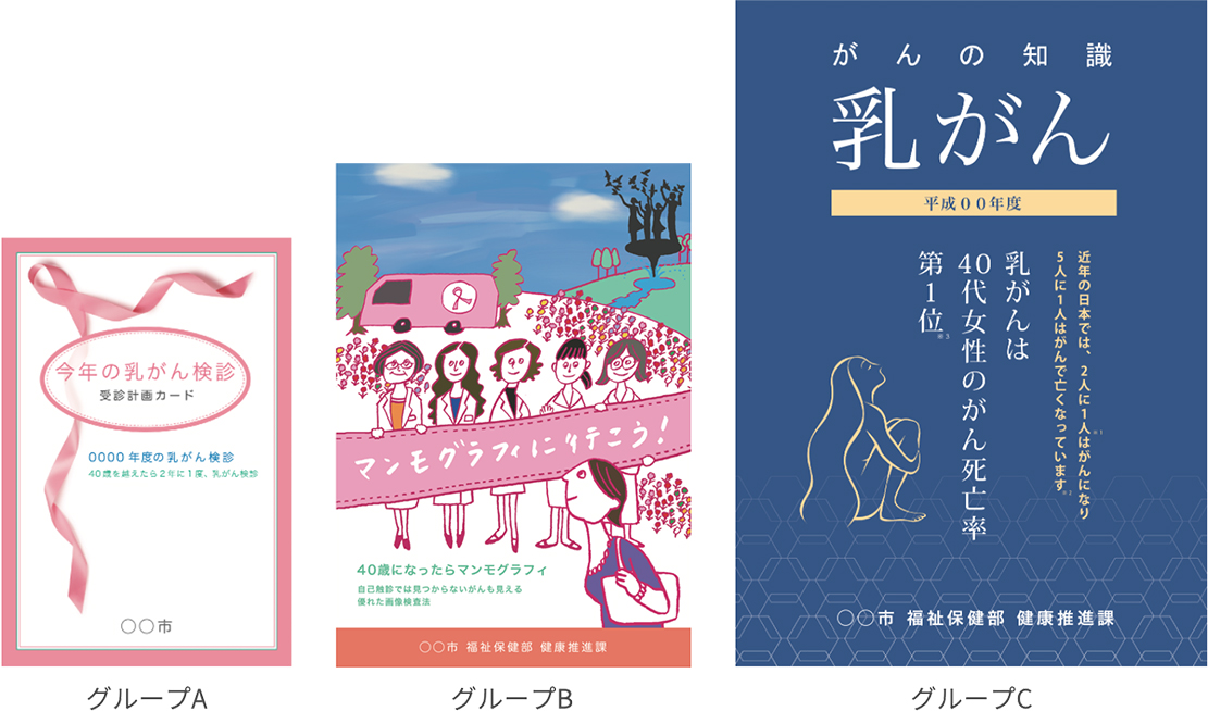 次に取り組んだのは、各グループの検診に対するハードルを取り除くようなメッセージを作ることでした。グループAにはがん検診の予約方法と、検査費用が約90 %も割引になることを明記した資材を作成しました。グループBには恐怖をかきたてないようにイラストを適宜使用しながら、乳がんの早期発見がもたらす利点について丁寧に説明しました。グループCには乳がんという病気の恐ろしさと検診の重要性を強調する内容を記載しました。なお、比較対象となるグループの女性には、調査の前に自治体で使用されていた通知を送付しました。