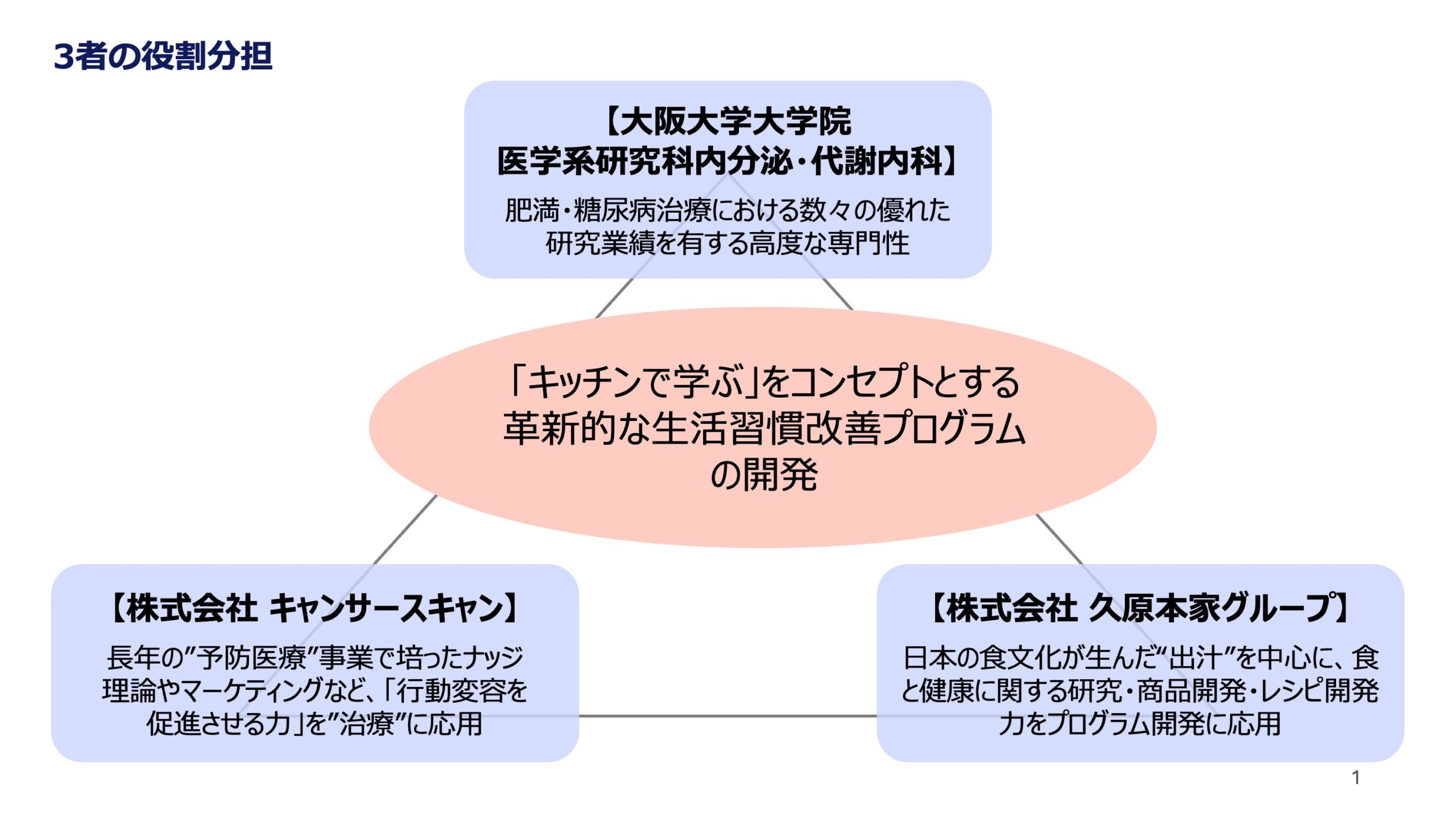 株式会社キャンサースキャン(本拠地:東京都品川区、代表:福吉 潤、以下 当社)は、2022年6月13日に、大阪大学大学院医学系研究科内分泌・代謝内科学(下村 伊一郎 教授、馬殿 恵 寄附講座准教授)と株式会社久原本家グループ本社(本社:福岡県糟屋郡久山町 代表取締役社長:河邉 哲司)による共同研究契約を完了し、「キッチンで学ぶ生活習慣改善法」をコンセプトとする新しい生活習慣改善プログラムの開発と、その肥満・糖尿病治療としての有効性評価をめざして共同研究を開始いたしました。