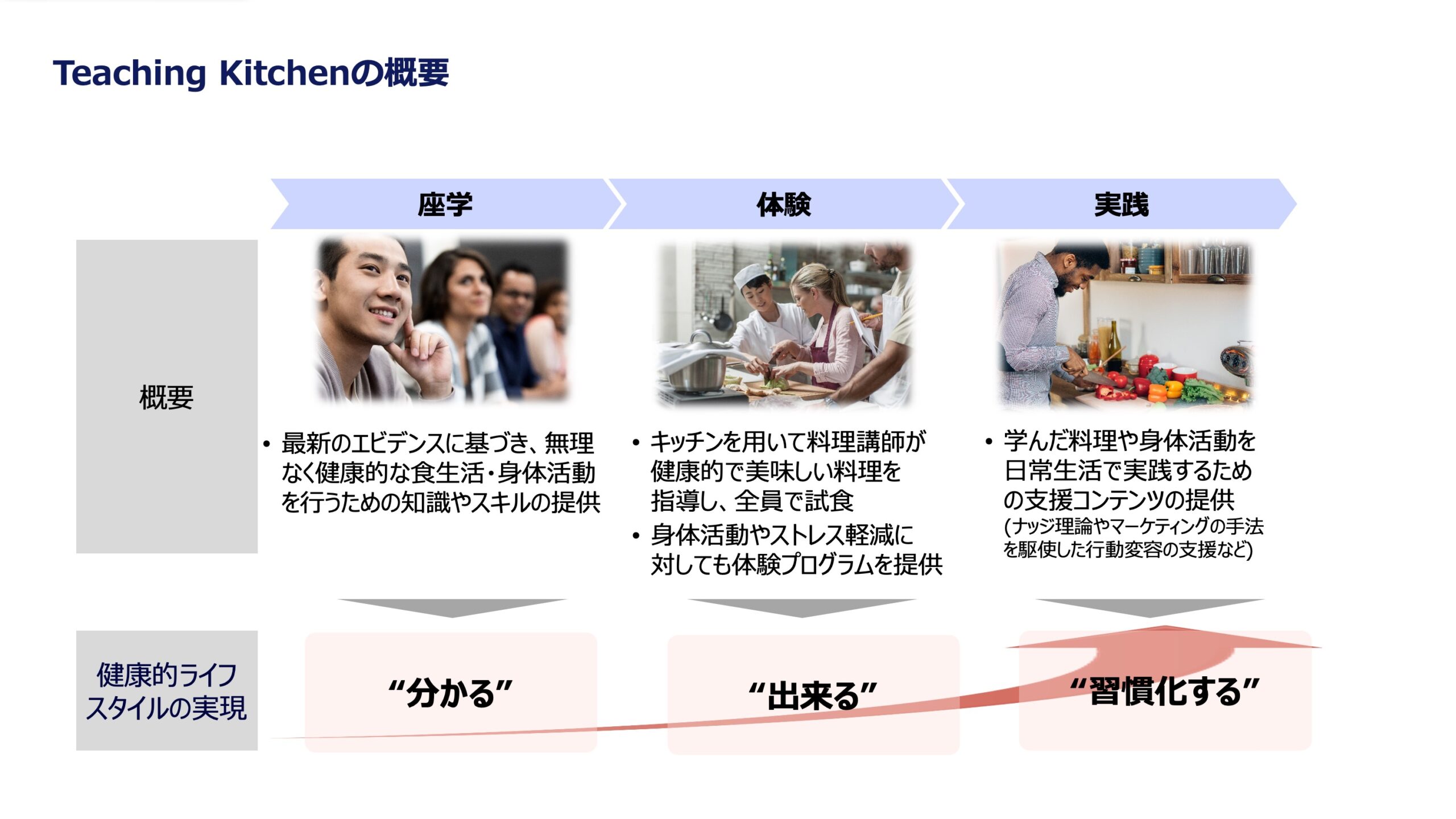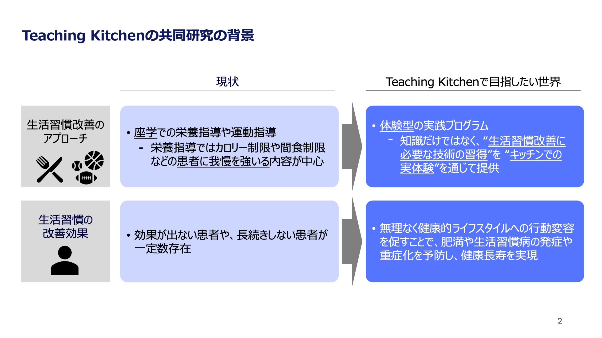 これまで、肥満や糖尿病の治療を目的とした生活習慣改善指導は、座学で行われる栄養指導や運動指導が中心でした。しかし、本プログラムでは、患者やその家族が「知識だけでなく、生活習慣改善に必要な技術を習得すること」に焦点を当てています。プログラムの最大の特徴はこうした技術の習得を全て”キッチンでの実体験”を通じて行うこと。例えば、食生活に関しては、最新の栄養学のエビデンスに基づく座学に、調理実習と試食を組み合わせ、実践的な食生活改善技術を習得するところまでを目指します。同様のアプローチを、身体活動やストレス軽減に対しても行い、座学のみではなかなか身につかない生活習慣改善に必要な技術の習得を可能にするプログラムを目指します。