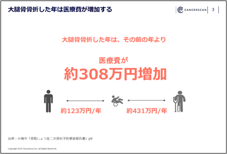 また、キャンサースキャンWEBサイトにて、本セミナーで使用した資料を公開いたしました。資料では、骨折による医療費への影響、北海道小樽市での骨粗しょう症疾患啓発の取り組みについてまとめており、どなたでもご覧いただけます。