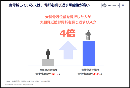 また、キャンサースキャンが北海道小樽市等とともに実施し、一度骨折を経験した骨折ハイリスク者を医療機関への受診を促すことができた骨粗しょう症疾患啓発の取り組み事例も紹介しています。