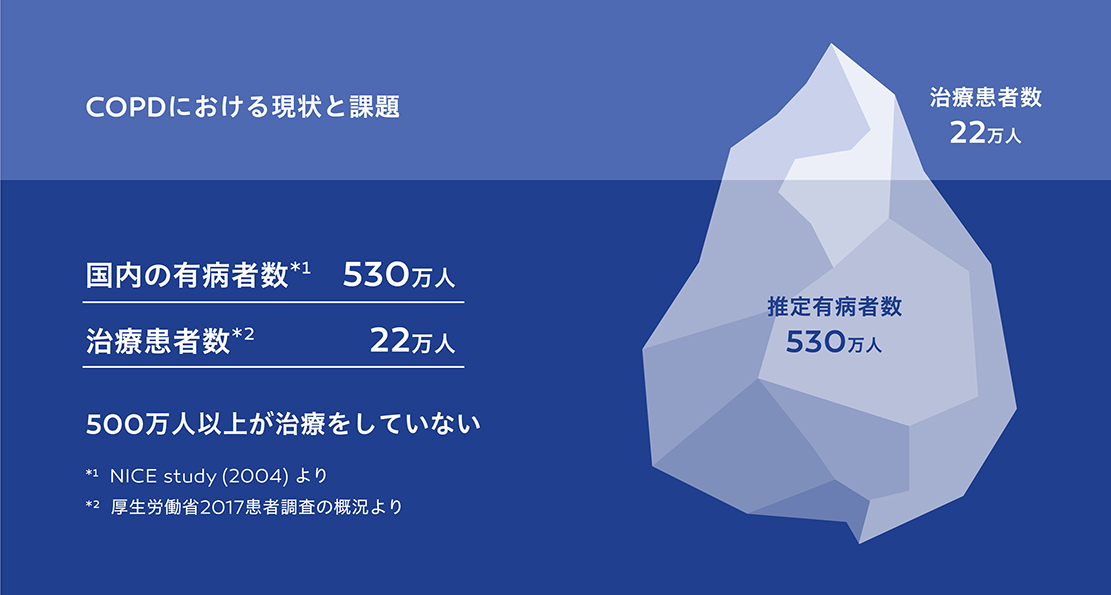 COPDの国内の有病者数は約530万人と推計されていますが、治療している患者数は1割にも満たないといわれており、未治療者が多いことが課題の一つです。症状が現れても、加齢によるものとして見過ごされやすいのも原因の一つであり、COPDと気付かずに発見が遅れてしまうことも少なくありません。こうした現状を改善するには、COPDの認知度向上だけではなく、肺機能検査のさらなる普及・実施を進めていくことが重要です。キャンサースキャンではリスクが高まる高齢者や喫煙者に向けた疾患啓発活動を展開しています。