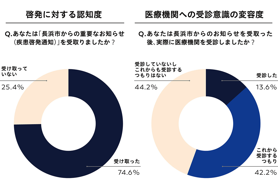 ターゲットを明確にした自治体からの啓発は、送付した通知を「自分事」として受け取りやすくするのに効果を発揮します。滋賀県長浜市との事業では、疾患の啓発通知送付後に行った対象者へのアンケート調査において、全体の約74%が「受け取った」と回答しました。また、回答者の約56%が医療機関の受診状況について「受診した」または「これから受診するつもり」と回答し、対象者の意識変容に対する一定の成果を得ることができました。さらに、比較群(前年同時期の同条件対象者)に比べ、ハイリスク者や治療中断者の医療機関受診率がそれぞれ約1.5倍に増加するなど、実際の行動変容にもつながっていることを確認しています。